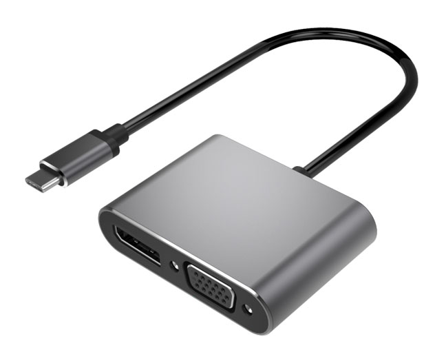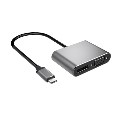本产品为二合一高清视频转接器,,,,,,,USB-C接口支持DP1.2 alt mode 信号输入,,,,,,,VGA和DP1.2信号输出,,,,,,,VGA接口支持1080P区分率,,,,,,,DP支持4K/60Hz区分率,,,,,,,不支持两口同时显示。。。。。。。将USB-C公头插入电脑/平板等有USB TYPE C接口的主机装备,,,,,,,再用VGA/DP线毗连有VGA/DP接口的显示器/投影仪等装备,,,,,,,即可将电脑的界面复制到显示器上面。。。。。。。一个二合一转接器可提供两种选择以兼容差别接口的显示装备。。。。。。。
